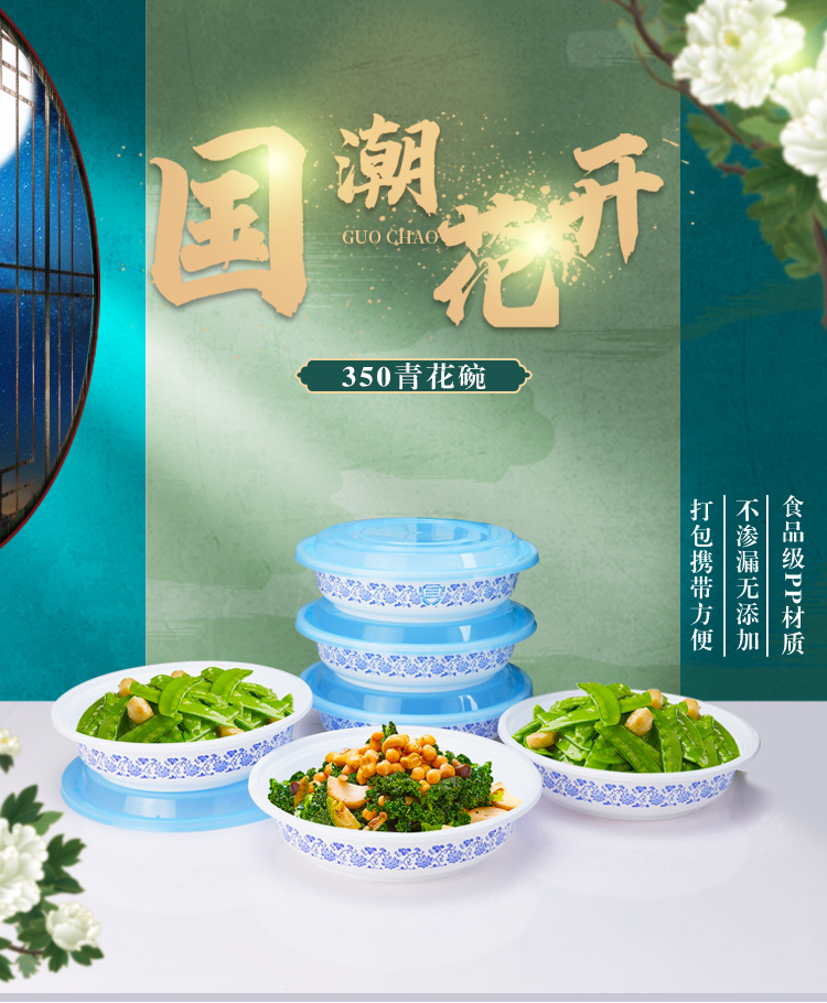 绿保康LBK-Y350青花碗一次性餐盒便当盒快餐外卖打包盒子加厚圆形塑料饭碗商用家用批发