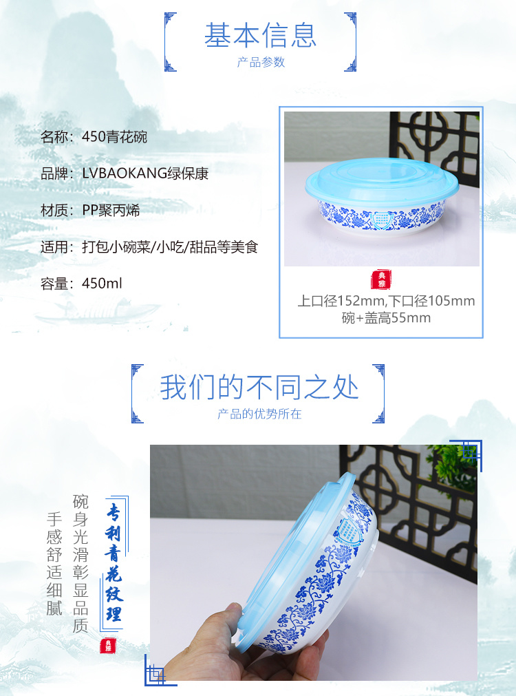 绿保康LBK-Y450青花碗一次性餐盒便当盒快餐外卖打包盒子加厚圆形塑料饭碗商用家用批发