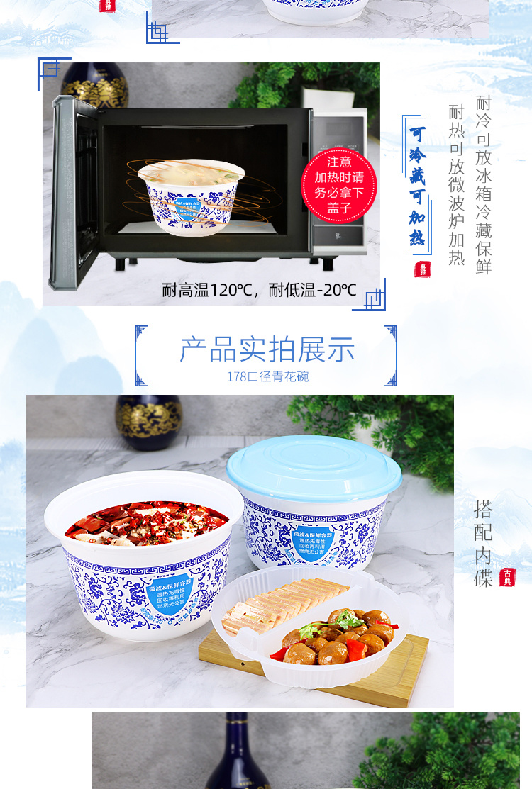 绿保康LBK-1250青花碗一次性餐盒便当盒快餐外卖打包盒子加厚圆形塑料饭碗商用家用批发