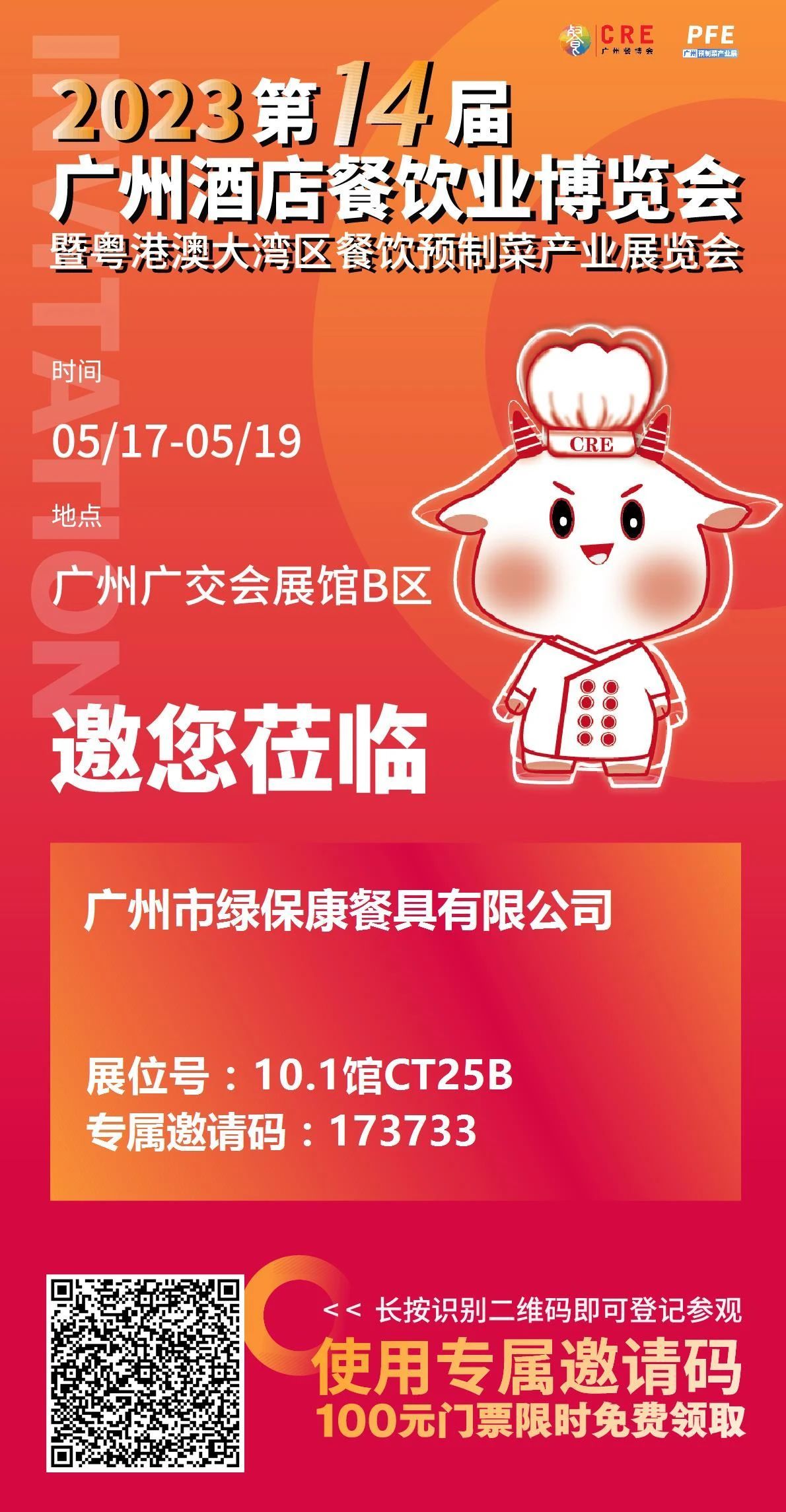 2023第14届 CRE 中-国(广州)酒店餐饮业博览会(以下简称:第14届 CRE 中-国餐博会),将于 2023年 5月17 - 19日,广州 ·广交会展馆 B 区一楼盛大举办!绿保康诚邀您参加此次会议!
